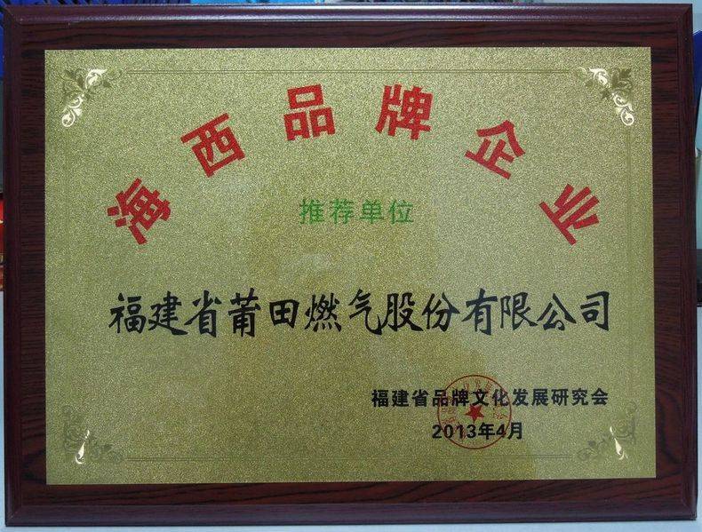 2013年04月 莆田燃氣被福建省品牌文化發(fā)展研究會推薦為 “海西品牌企業(yè)”