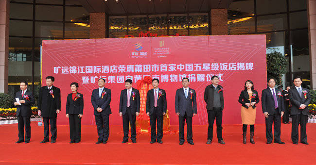 曠遠(yuǎn)錦江國際酒店正式被國家旅游局授予“中國五星級(jí)飯店”稱號(hào),這是莆田首家獲得官方認(rèn)證的五星級(jí)飯店。2013年2月6日下午,莆田市荔城區(qū)委、區(qū)政府在曠遠(yuǎn)錦江國際酒店舉行了簡約而隆重的五星揭牌儀式,省、市、區(qū)等各級(jí)領(lǐng)導(dǎo)出席了揭牌儀式。儀式上,省旅游局領(lǐng)導(dǎo)宣讀了國家旅游局關(guān)于批準(zhǔn)曠遠(yuǎn)錦江國際酒店榮膺中國五星級(jí)飯店的批文,莆田市領(lǐng)導(dǎo)、上海錦江酒店管理集團(tuán)代表、曠遠(yuǎn)集團(tuán)董事長王子林分別致辭,省、市、區(qū)等有關(guān)領(lǐng)導(dǎo)及曠遠(yuǎn)集團(tuán)董事長王子林共同揭牌。在揭牌儀式后,王子林董事長代表曠遠(yuǎn)集團(tuán)向莆田市博物館捐款兩百萬元,莆田市副市長張麗冰代表市政府接受捐贈(zèng)。