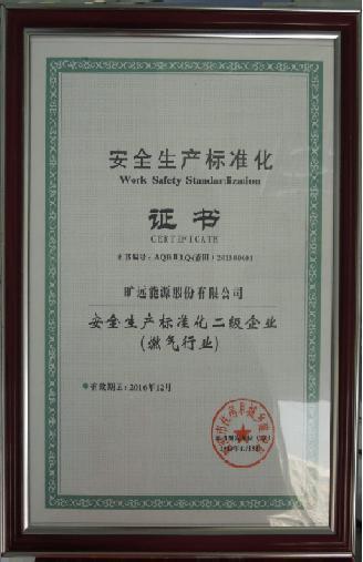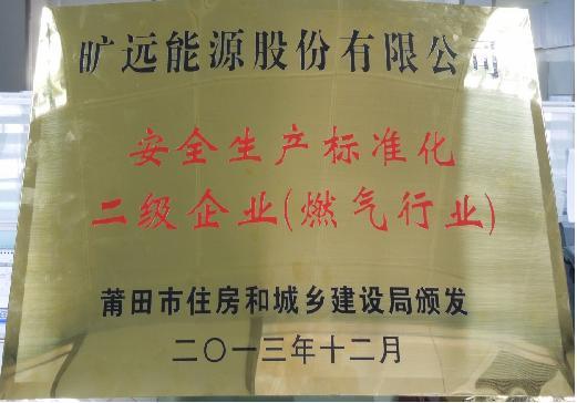 2013年12月27日,莆田市住建局正式授予曠遠(yuǎn)能源“安全生產(chǎn)標(biāo)準(zhǔn)化二級(jí)企業(yè)”證書匾額,這是繼2011年曠遠(yuǎn)能源獲燃?xì)馄髽I(yè)安全生產(chǎn)考核A級(jí)認(rèn)定后的又一安全生產(chǎn)殊榮。