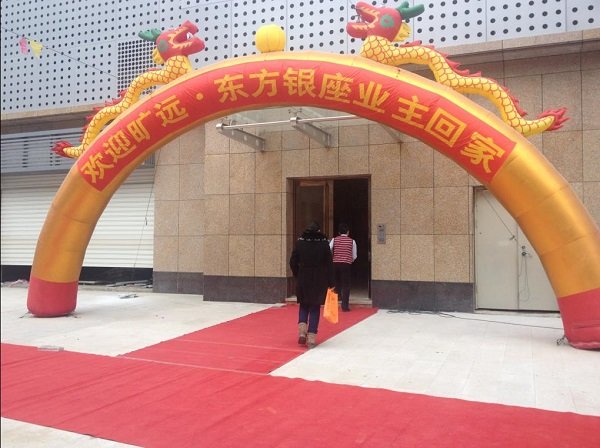 交房當天,曠遠·東方銀座物業(yè)服務中心現(xiàn)場井然有序,喜氣洋洋,業(yè)主們都沉浸在收獲的喜悅中。銷售現(xiàn)場外,花柱、拱門、彩旗迎風飛舞,迎接著每一位業(yè)主的入住。