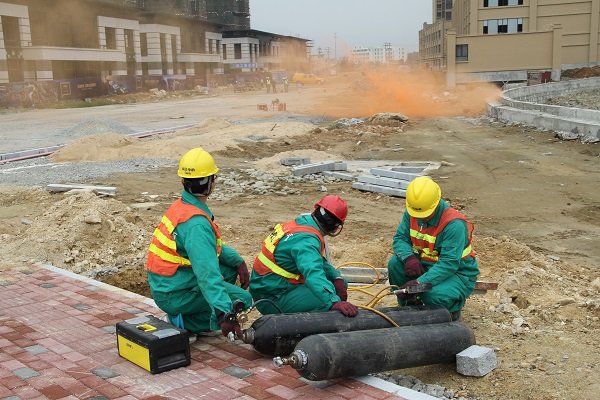 當(dāng)天上午9:30,管網(wǎng)部2652111值班搶險(xiǎn)電話驟響:“位于萬(wàn)科小區(qū)附近,燃?xì)夤艿涝谑┕み^(guò)程中不慎挖破,造成燃?xì)庑孤┲?,?qǐng)盡快搶修處理”。值班人員隨后立即向119報(bào)警并上報(bào)運(yùn)行中心總監(jiān)黃劍鋒,黃總監(jiān)接到通報(bào)后立即啟動(dòng)公司突發(fā)事故應(yīng)急預(yù)案,并向曠遠(yuǎn)能源總經(jīng)理姜升科匯報(bào)事故發(fā)生情況。事故發(fā)生15分鐘后,各應(yīng)急處理小組奔赴現(xiàn)場(chǎng),各就各位:泄漏源控制小組立即疏散現(xiàn)場(chǎng)人員、設(shè)立警戒,緩緩關(guān)閉上下游閥門并通入氮?dú)膺M(jìn)行置換;消防小組配合消防利用水槍進(jìn)行管道降溫和燃?xì)怛?qū)散;搶修組人員在確認(rèn)燃?xì)鉂舛冉档偷桨踩孪藓罅⒓磳?duì)燃?xì)夤苓M(jìn)行修復(fù),并在冷卻后進(jìn)行試壓檢查;控制小組使用檢測(cè)儀對(duì)著火點(diǎn)附近進(jìn)行濃度檢測(cè),確保周邊環(huán)境安全后恢復(fù)正常供氣。