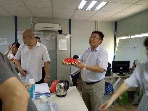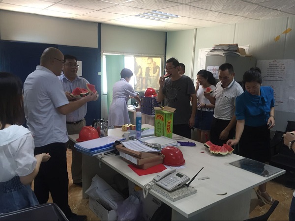 7月27日,集團(tuán)副總裁姜升科、貿(mào)易事業(yè)部總經(jīng)理李曉敏,在長(zhǎng)沙公司常務(wù)副總陳志高和營(yíng)銷總監(jiān)李兆堂等的陪同下,帶著西瓜、涼茶、藿香正氣水等防暑物品首先來(lái)到曠遠(yuǎn)·洋湖18克拉項(xiàng)目,對(duì)營(yíng)銷部、財(cái)務(wù)部、綜合部、工程部等部門員工進(jìn)行了親切慰問(wèn)。每到一處,姜副總裁都緊緊握住員工的雙手,代表集團(tuán)對(duì)他們的辛苦工作表示感謝,同時(shí)送上了防暑降溫物品,囑咐他們要注意身體,在高溫酷暑下工作要合理安排好作息時(shí)間。“烈日正當(dāng)頭,涼意滲心懷”,集團(tuán)領(lǐng)導(dǎo)送去的不只是清涼,更帶給大家親切的關(guān)懷和有力的鼓舞。