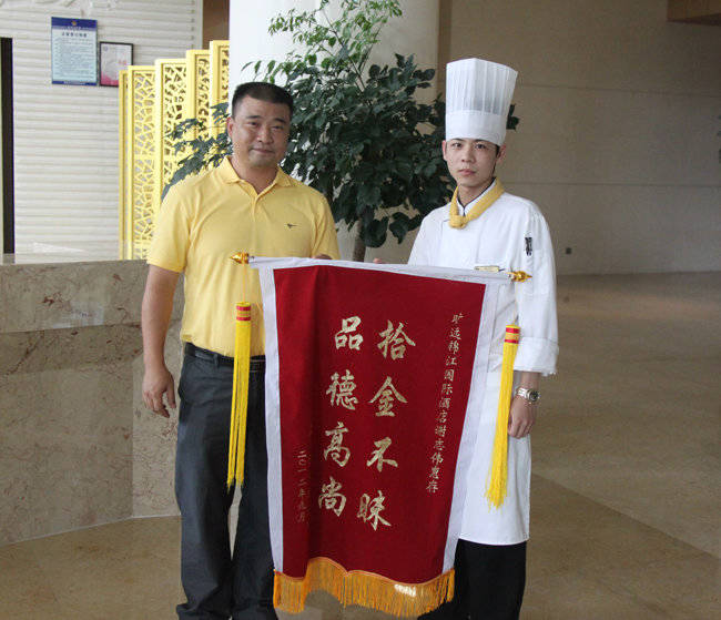 9月8日下午,來(lái)自廈門(mén)的陳德明將印有“拾金不昧 品德高尚”的錦旗交到曠遠(yuǎn)錦江國(guó)際酒店西廚師長(zhǎng)謝志偉的手中,以表示對(duì)謝志偉拾金不昧的良好行為以及酒店員工所表現(xiàn)出來(lái)的職業(yè)素養(yǎng)的感謝。