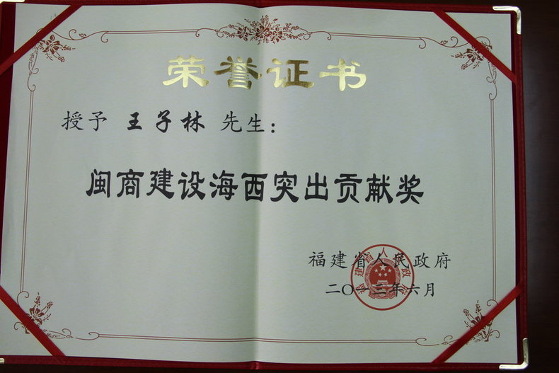 2013年06月 王子林董事長榮獲“閩商建設海西突出貢獻獎”榮譽稱號