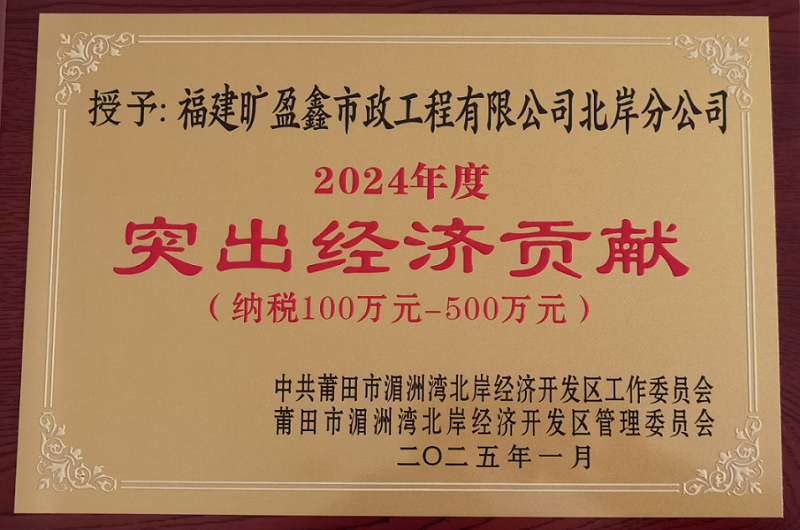 2025年1月 福建曠盈鑫市政工程有限公司北岸分公司被中共莆田市湄洲灣北岸經(jīng)濟(jì)開發(fā)區(qū)工作委員會(huì)、莆田市湄洲灣北岸經(jīng)濟(jì)開發(fā)區(qū)管理委員會(huì)授予“2024年度突出經(jīng)濟(jì)貢獻(xiàn)(納稅100萬元-500萬元)”榮譽(yù)