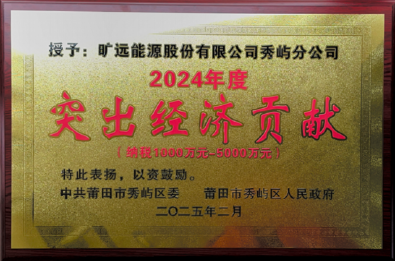 曠遠(yuǎn)能源股份有限公司秀嶼分公司被中共莆田市秀嶼區(qū)委、莆田市秀嶼區(qū)人民政府授予“2024年度突出經(jīng)濟(jì)貢獻(xiàn)(納稅1000萬元-5000萬元)”榮譽(yù)