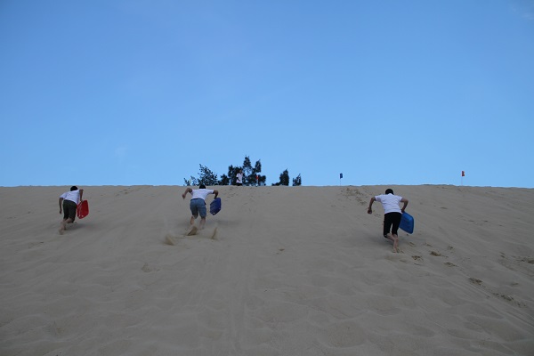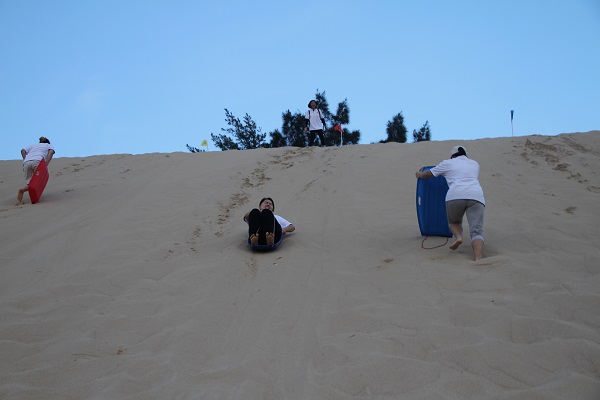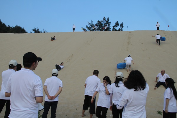 作為團(tuán)建活動(dòng)的第一個(gè)項(xiàng)目,滑沙比賽雖看似簡(jiǎn)單,其實(shí)不易。比賽規(guī)則為:在陡峭的沙丘上,每隊(duì)的前一名隊(duì)員從沙嶺乘坐滑沙板下滑至山腳,后一名成員取走滑沙板后爬上沙丘再下滑,全隊(duì)成員依次完成接力,最先完成的隊(duì)伍獲勝。為了團(tuán)隊(duì)榮譽(yù),隊(duì)員們不顧沙丘上的阻擾,奮力拼搏,最終,蛟龍隊(duì)在該項(xiàng)目中取得勝利。精彩的比賽使得大家意猶未盡,于是現(xiàn)場(chǎng)臨時(shí)加賽,由每隊(duì)副隊(duì)長代表所在隊(duì)伍進(jìn)行比拼,在該輪比拼中,風(fēng)車隊(duì)勝出。