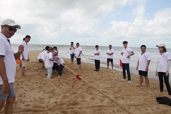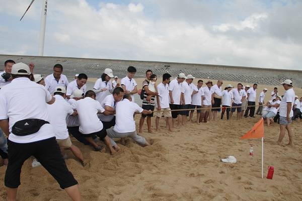 23日上午7:40,所有成員出發(fā)九重山,在九重山山腳下徒步至山頂,比賽規(guī)則為最先到達(dá)山頂?shù)年?duì)伍(全隊(duì)成員)獲勝。一行人員浩浩蕩蕩向著目標(biāo)前進(jìn),一路上隊(duì)員們互相打氣、互相扶持,堅(jiān)持走向了終點(diǎn)。海神隊(duì)以全員最快到達(dá)山頂?shù)膬?yōu)勢(shì)取得該項(xiàng)目的勝利。緊接著,所有成員趕赴東戶黃金沙灘,開展沙灘拔河比賽。比賽過程中,所有成員勁往一處使,有人被拔河繩擦傷,有人摔倒在了沙灘上,但卻絲毫未動(dòng)搖他們?yōu)閳F(tuán)隊(duì)爭(zhēng)取榮譽(yù)的信念,他們將傷痛拋在了腦后,竭力爭(zhēng)取,最終,海神隊(duì)贏得了拔河比賽的冠軍。