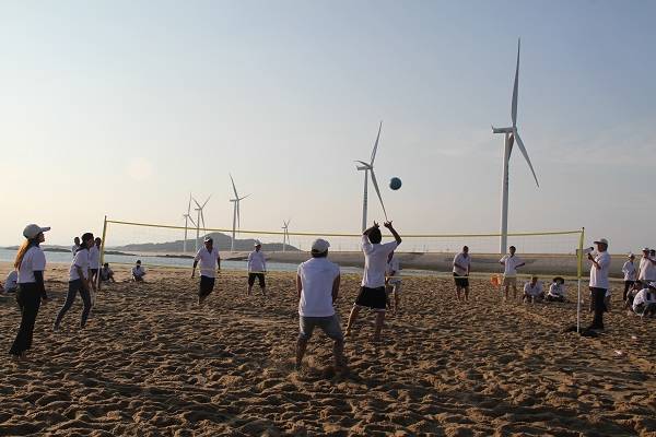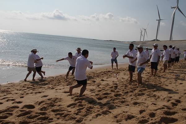 22日下午13:30,全體人員在莆田辦公樓一樓集合后,統(tǒng)一乘坐大巴前往石城碼頭,搭乘輪船至南日島。當(dāng)天下午15:30到達(dá)南日島后,經(jīng)過一番修整,全體人員即刻前往南日島皇帝山沙灘?;顒?dòng)首先將人員分成四組,推選出小組組長后,各隊(duì)分別為自己所在隊(duì)伍取隊(duì)名,分別為蛟龍隊(duì)、海龍隊(duì)、海神隊(duì)、風(fēng)車隊(duì)。隨后,隊(duì)長帶領(lǐng)隊(duì)員選取副隊(duì)長,并為團(tuán)隊(duì)取口號(hào),進(jìn)行了團(tuán)隊(duì)風(fēng)采展示。各隊(duì)儼然進(jìn)入了“戰(zhàn)斗”狀態(tài),迫不及待地趕往沙丘開展滑沙比賽。