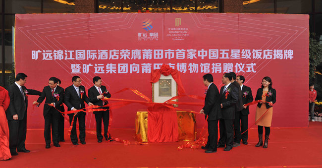 曠遠(yuǎn)錦江國際酒店正式被國家旅游局授予“中國五星級(jí)飯店”稱號(hào),這是莆田首家獲得官方認(rèn)證的五星級(jí)飯店。2013年2月6日下午,莆田市荔城區(qū)委、區(qū)政府在曠遠(yuǎn)錦江國際酒店舉行了簡約而隆重的五星揭牌儀式,省、市、區(qū)等各級(jí)領(lǐng)導(dǎo)出席了揭牌儀式。儀式上,省旅游局領(lǐng)導(dǎo)宣讀了國家旅游局關(guān)于批準(zhǔn)曠遠(yuǎn)錦江國際酒店榮膺中國五星級(jí)飯店的批文,莆田市領(lǐng)導(dǎo)、上海錦江酒店管理集團(tuán)代表、曠遠(yuǎn)集團(tuán)董事長王子林分別致辭,省、市、區(qū)等有關(guān)領(lǐng)導(dǎo)及曠遠(yuǎn)集團(tuán)董事長王子林共同揭牌。在揭牌儀式后,王子林董事長代表曠遠(yuǎn)集團(tuán)向莆田市博物館捐款兩百萬元,莆田市副市長張麗冰代表市政府接受捐贈(zèng)。