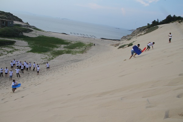 22日下午13:30,全體人員在莆田辦公樓一樓集合后,統(tǒng)一乘坐大巴前往石城碼頭,搭乘輪船至南日島。當(dāng)天下午15:30到達(dá)南日島后,經(jīng)過一番修整,全體人員即刻前往南日島皇帝山沙灘?;顒邮紫葘⑷藛T分成四組,推選出小組組長后,各隊分別為自己所在隊伍取隊名,分別為蛟龍隊、海龍隊、海神隊、風(fēng)車隊。隨后,隊長帶領(lǐng)隊員選取副隊長,并為團(tuán)隊取口號,進(jìn)行了團(tuán)隊風(fēng)采展示。各隊儼然進(jìn)入了“戰(zhàn)斗”狀態(tài),迫不及待地趕往沙丘開展滑沙比賽。